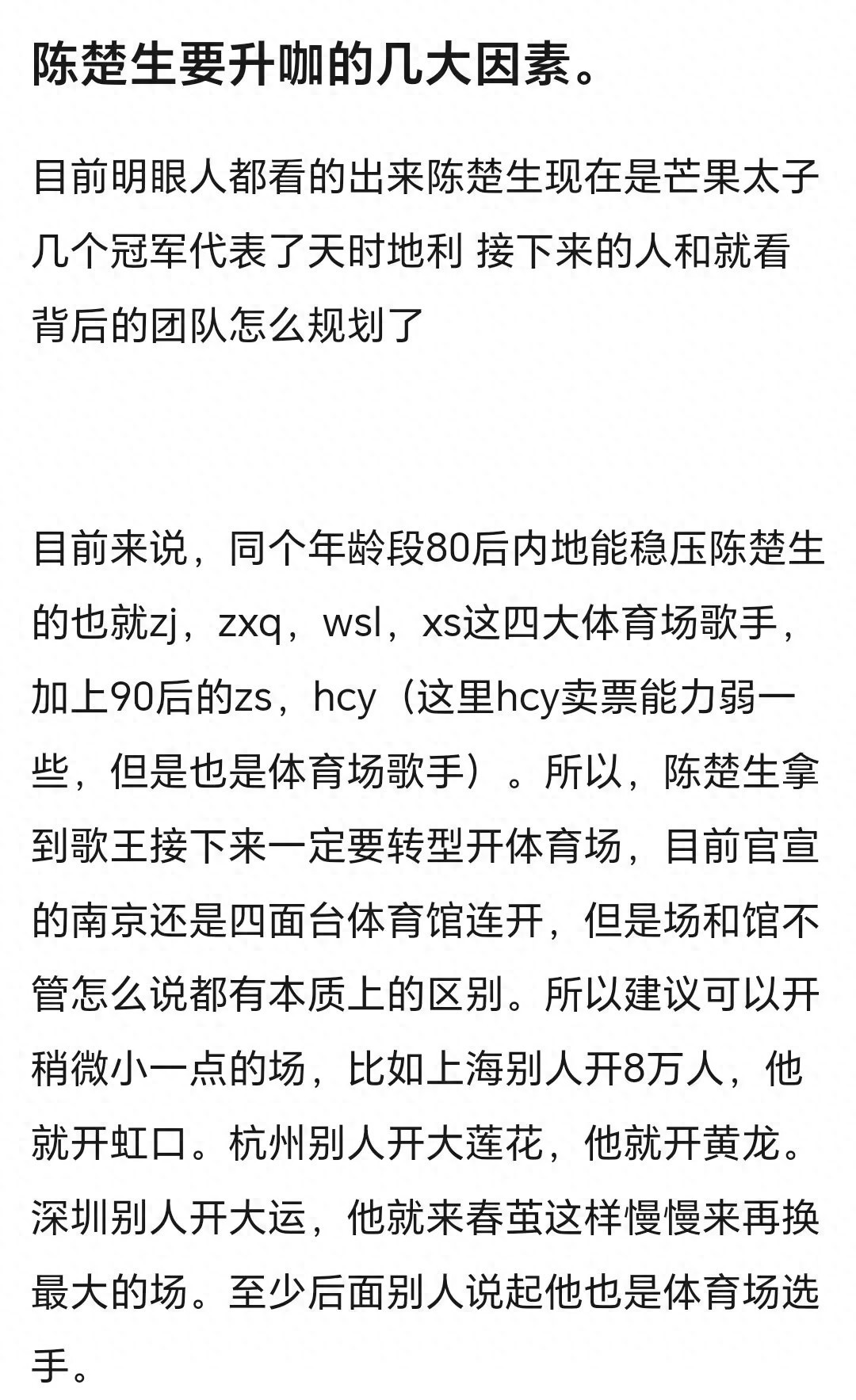 至少从面前的行业近况来看,我觉得陈楚生要完结咖位升级依然面对不小挑战。