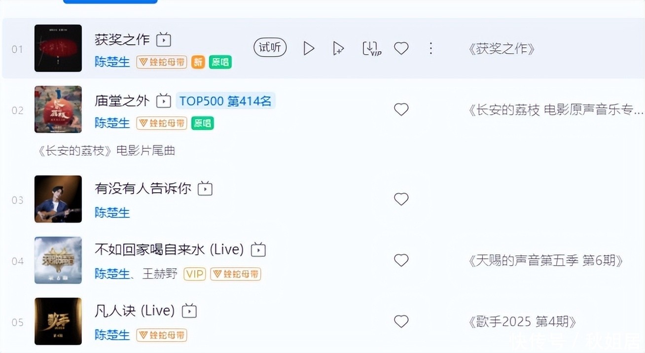 暂且不谈达到周杰伦、林俊杰这么的顶级歌手高度,从粉丝群体的期待来看,他们更但愿陈楚生能至少达到李荣浩、张杰所处的艺东说念主层级。