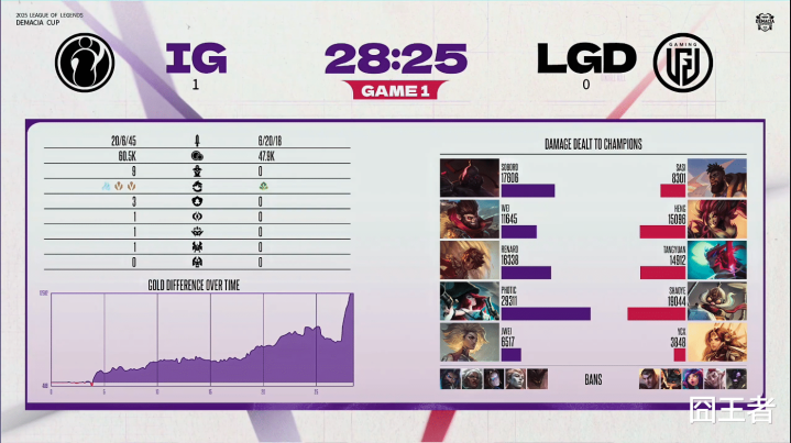 后果第一局比赛,被IG打成了片面的碾压局,LGD毫无还手的余步。5分钟傍边,Photic实时支维持IG完成1换4团战;22分钟傍边,IG最初拿下厄塔汗,随后Jwei芮尔齐备开团IG乘胜逐北扩大上风;25分钟傍边,Wei与Soboro长远敌阵遭到集火击杀,LGD打出一波1换2;最终28分25秒,IG团灭LGD,先赢一局!