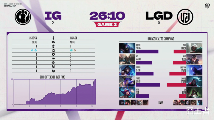 后果第二局比赛,IG透顶打海,单方碾压了LGD,获取顺利。4分钟傍边,Shaoye单杀Photic,但LGD三东说念主强行打架一齐死心;15分钟傍边,两边下河说念打出2换2团战;18分钟傍边,LGD最初开打小龙,IG世东说念主搭救实时随后包夹取得团投诚利;最终26分10秒,IG团灭LGD,赢下比赛。