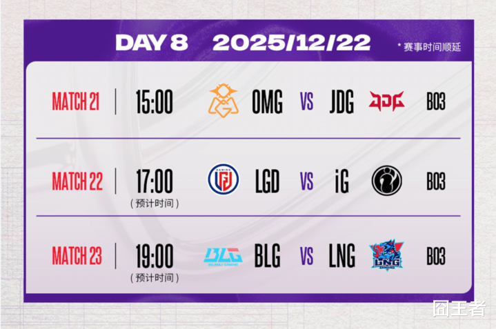 12月22日,三场比赛由OMG对阵JDG,LGD对阵IG,以及重头戏BLG大战LNG带来。在最初示寂的比赛中,JDG零封OMG;那么IG和LGD的比赛,谁又会笑到临了呢,让咱们拭目以俟。