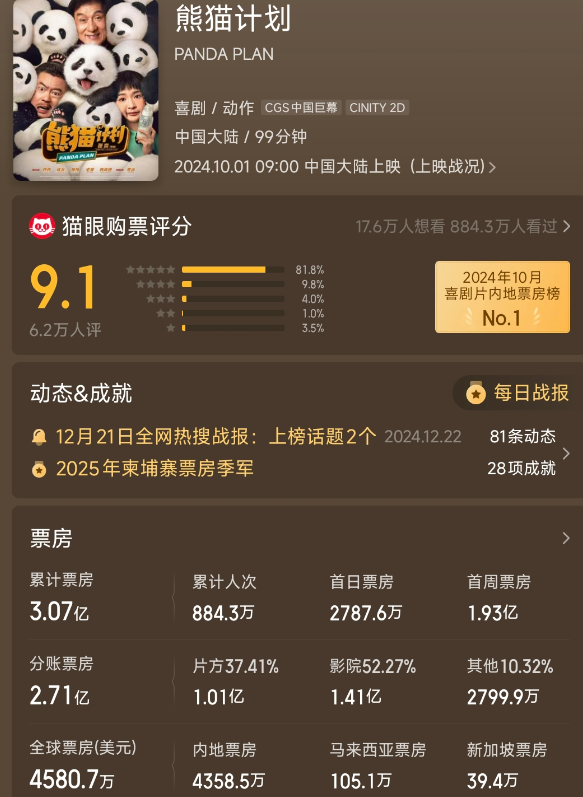 如斯一来,《过家家》赔本的钱,成龙真的有望凭借《熊猫霸术2》再赚回来,以致还能赚得更多。