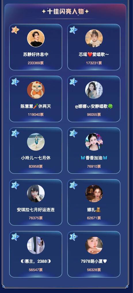 在六间房16周年庆之际,平台倾听用户心声,由见证平台迭代的资深用户们,秉抓平允平允的原则,票选出了最能代表六间房精神的“十佳闪亮主播”,这是他们经情意凝结的荣誉,亦然对整个获奖主播们的最高认同。