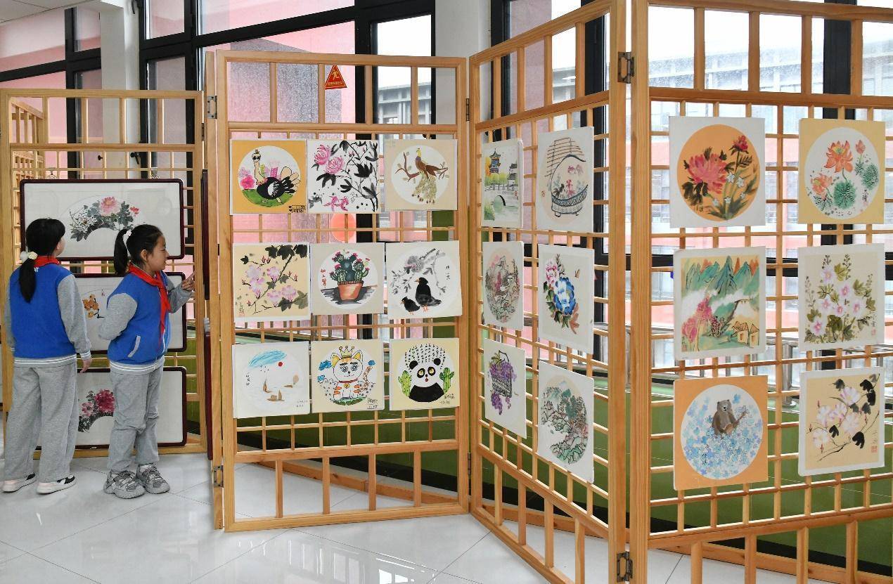 12月1日,学生在沧州高新区实验学校字画作品展前参不雅。苑立伟摄