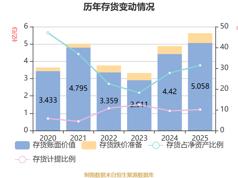 从存货变动来看,截止2025年末,公司存货账面价值为5.06亿元,占净金钱的31.41%,较上年末加多6375.92万元。其中,存货跌价准备为5675.87万元,计提比例为10.09%。