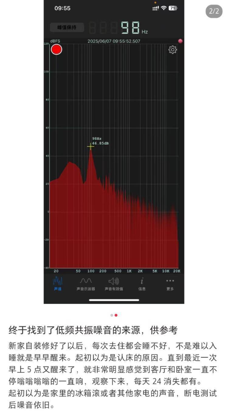 田先生示意,我方随后遗弃了家里空调、雪柜等电器的问题,随后在网上商量了一位专科自媒体博主,并在对方提倡下用有关软件测试了这个杂音,发现声息惟一40分贝,然则振动频率却达到98Hz(赫兹),最大的声息来自卧室与客厅之间的墙壁。“那时那位博主就告诉我,这个98Hz频段不是电梯便是水泵,况且很大可能是来自楼上。”